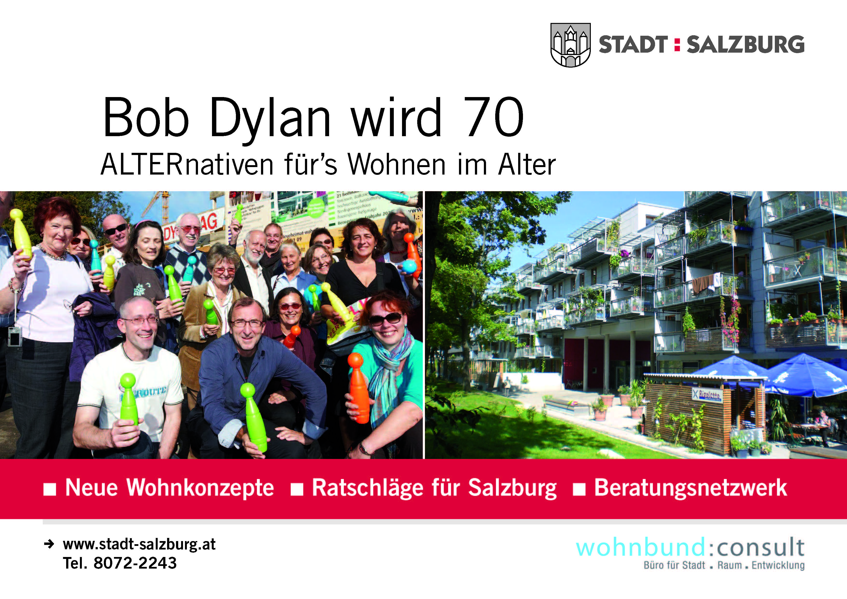 Zum Symposium „Bob Dylan wird 70 – ALTERnativen für’s Wohnen im Alter“ gibt es nun auch einen Tagungsband. Diese Broschüre finden Sie auf der Homepage der Stadt Salzburg als pdf. www.stadt-salzburg.at/wohnsymposium