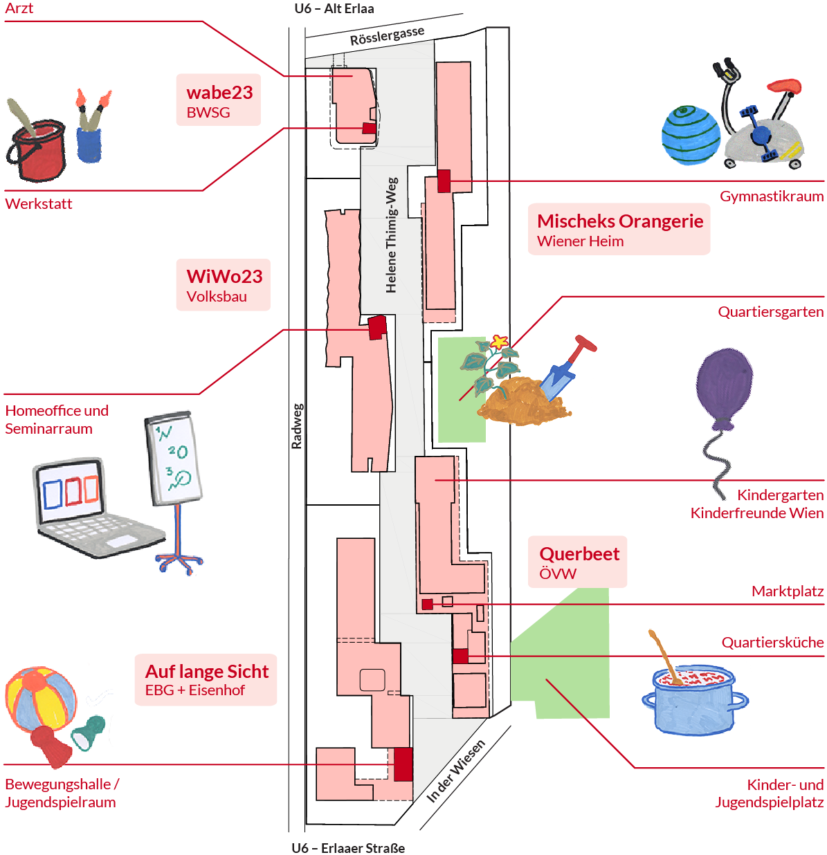 Quartiersdialog: Im Rahmen dessen werden u.a. Quartiersgruppen gefördert und Gemeinschaftsräume für die BewohnerInnen des gesamten Quartiers nutzbar gemacht. Begleitet und moderiert wird dieser Dialog vom Team von realitylab, wohnbund:consult, Diakoniewerk und Gartenpolylog.
