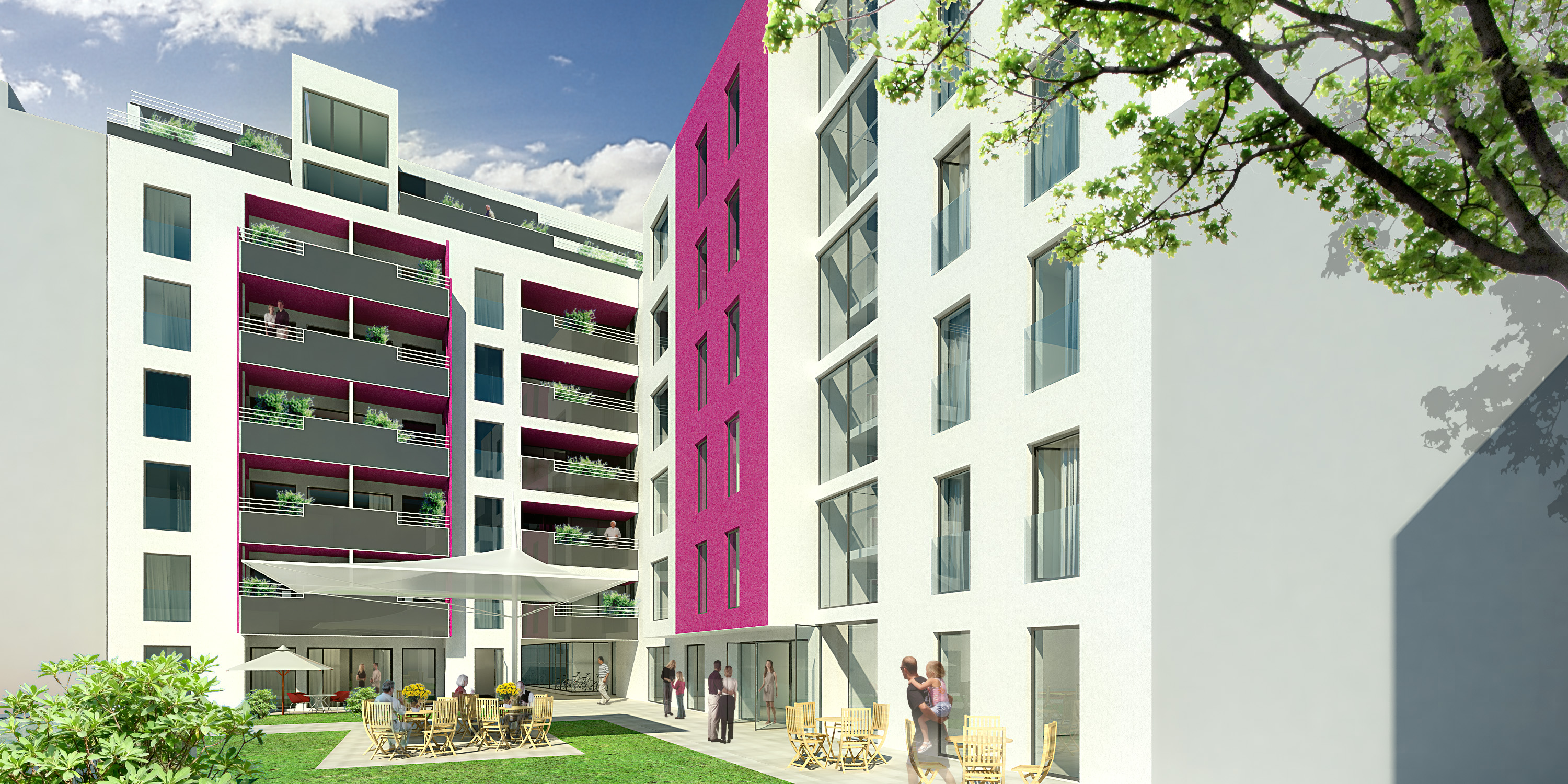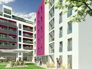 Das Projekt bietet 2 Wohngruppen Platz: das „Hofhaus“ (16 WE) und die „Wohnetage“ (7 WE) mit jeweils großzügigen Gemeinschaftsräumen und Terrassen.